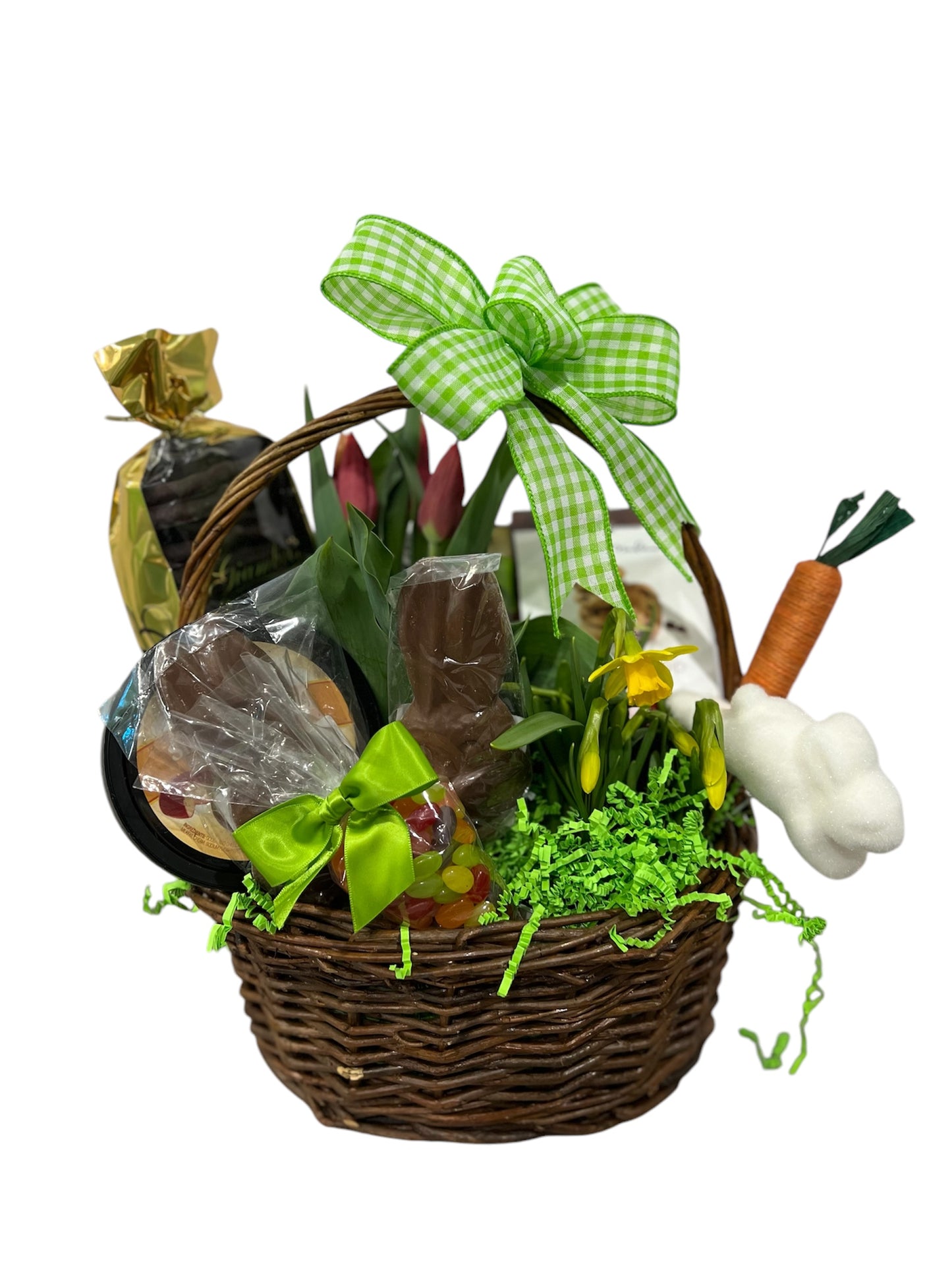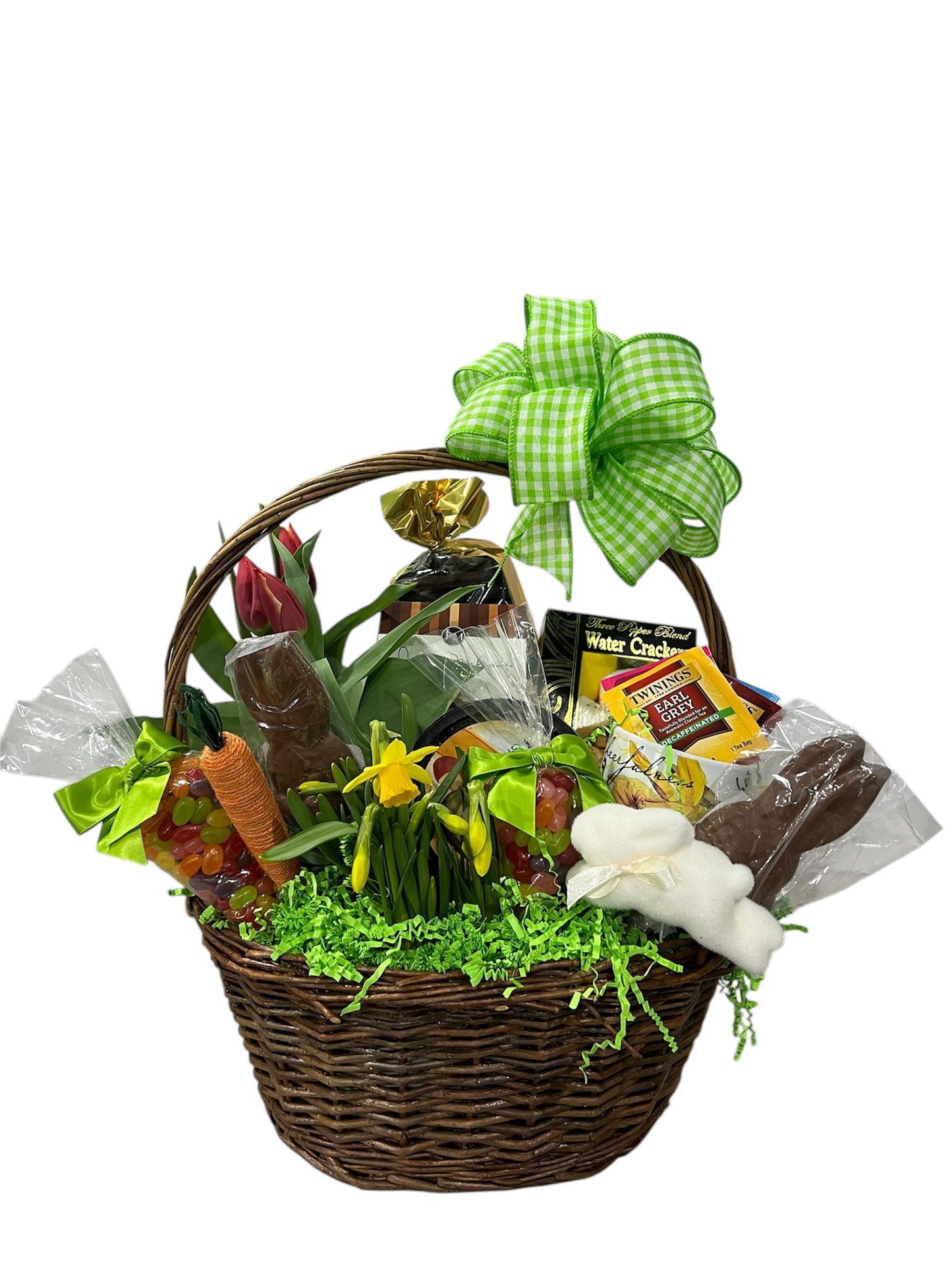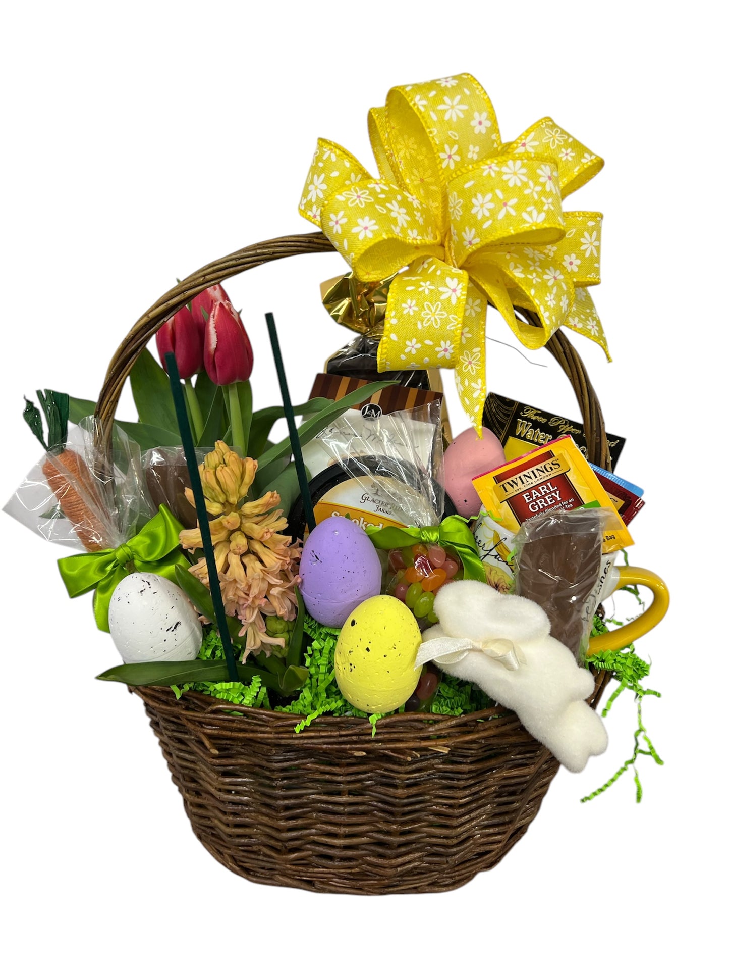 This thoughtfully curated gift features a blooming bulb, plantin a charming basket, ready to flourish and brighten her space. Alongside this living symbol of renewal, she’ll discover an assortment of gourmet chocolates, jellybeans, and a selection of premium cheeses and crackers to satisfy her savory cravings. To complete the experience, we’ve included a variety of luxurious teas, perfect for a moment of relaxation.