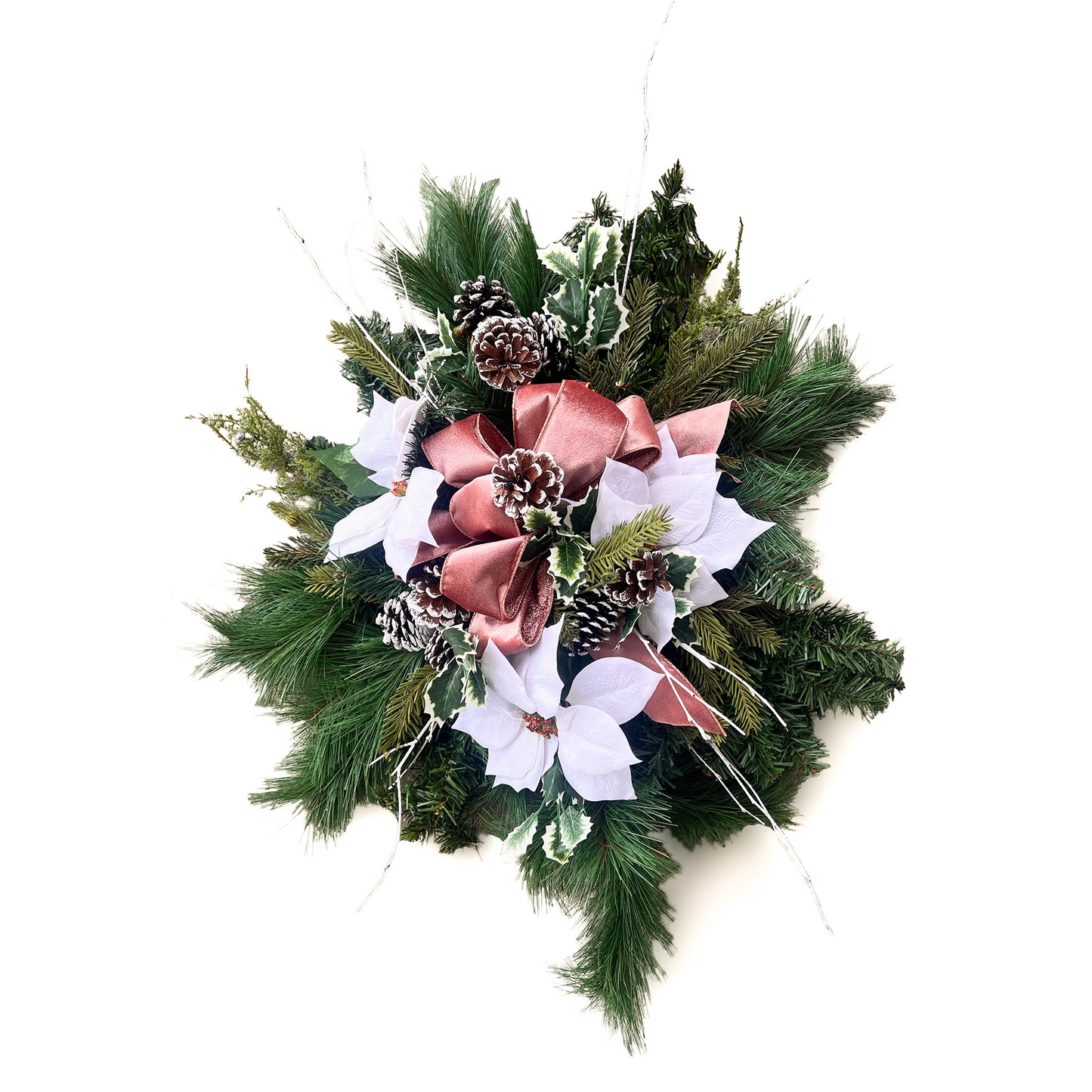 Grave blanket decorated with white poinsettias, pink/mauve bows, pinecones & Branches